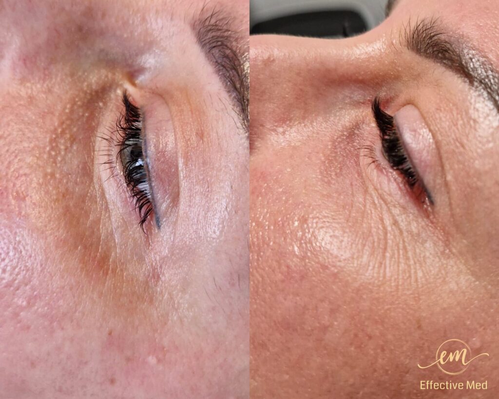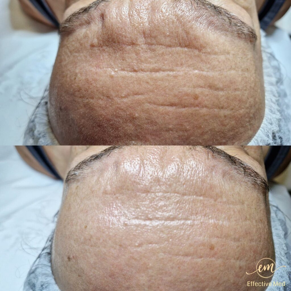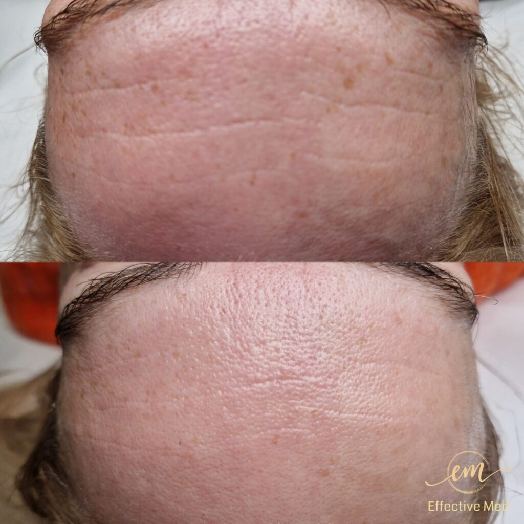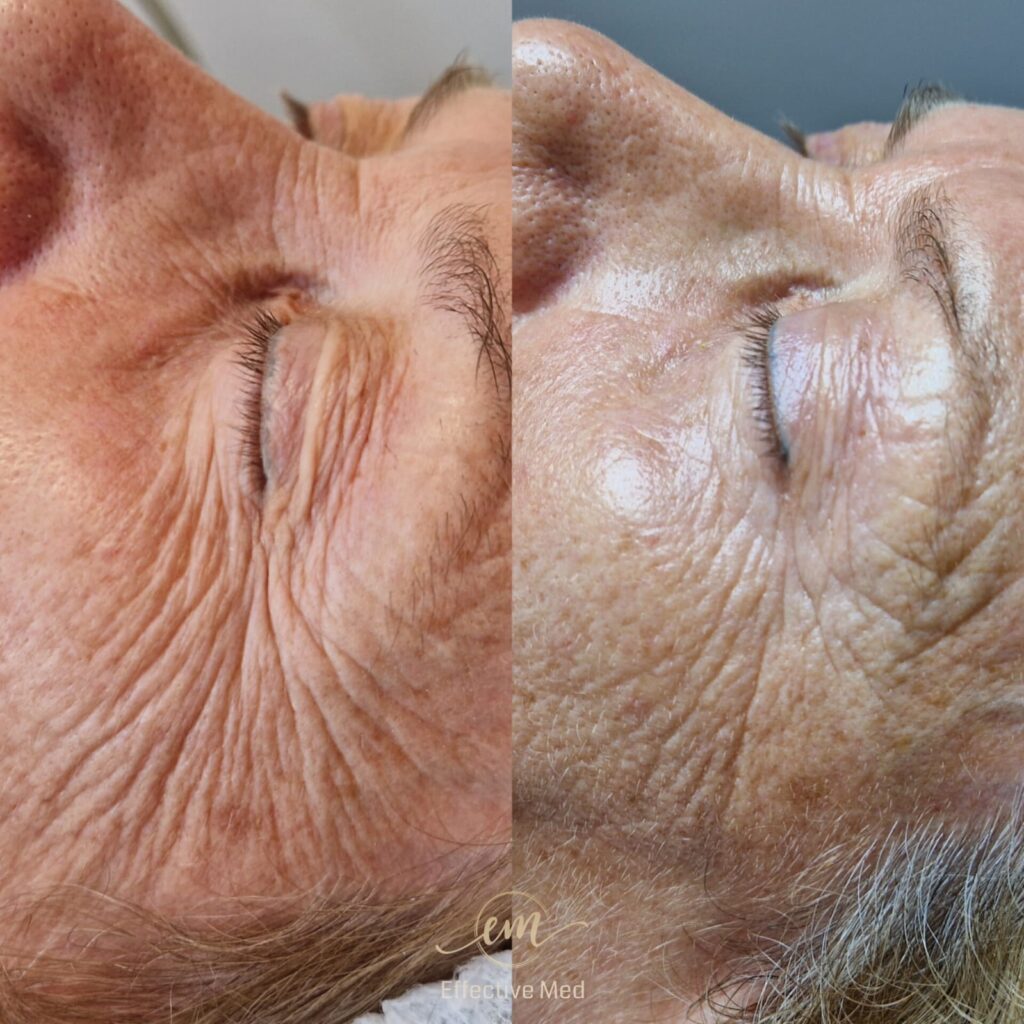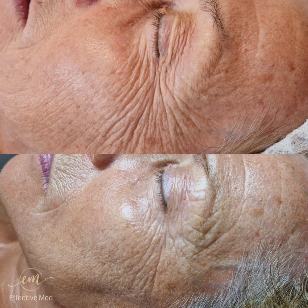 • Redukcja “kurzych łapek”: Wygładzenie zmarszczek mimicznych wokół oczu.