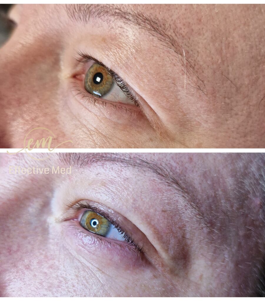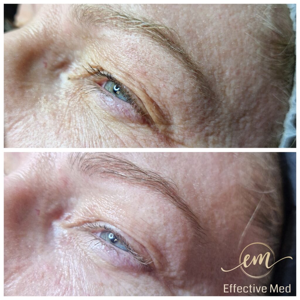 • Niechirurgiczny lifting powiek: Uniesienie opadającej powieki górnej i zagęszczenie wiotkiej skóry pod oczami.